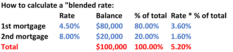 In the example above, 5.2 percent is your blended rate. You find it by figuring out how much of your total balance your first mortgage comprises (in this case, by dividing the $80,000 first mortgage by the $100,000 in total mortgages) and multiply that number by your interest rate. So in the above example, multiplying the 4.5 percent rate by the 80 percent portion of the home loan total, you get 3.6 percent.