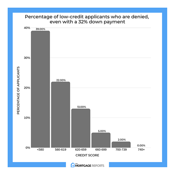 You’d think that with over 30 percent down payment or home equity, lenders would okay just about anyone. And if your score if 740 or higher, your chances of denial are about zero. But lenders often decline applicants with low FICO scores.